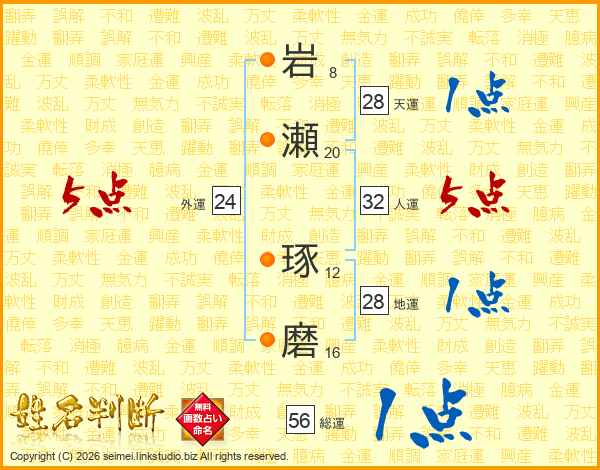 岩(8画)瀬(20画) 琢(12画)磨(16画)