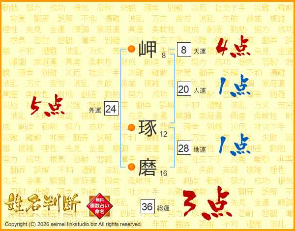 生活面を象徴する運勢です。外部から受ける影響力を表し、結婚運、家庭運や職場、環境への順応性を表します。総運から人運を引いた画数。姓や名が1文字の場合を除く。