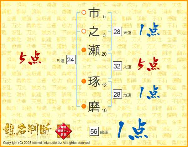 市(5画)之(3画)瀬(20画) 琢(12画)磨(16画)