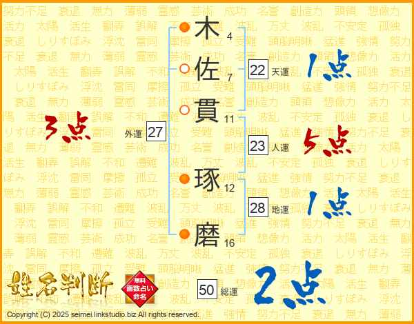 木(4画)佐(7画)貫(11画) 琢(12画)磨(16画)