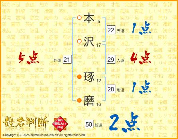 本(5画)沢(17画) 琢(12画)磨(16画)