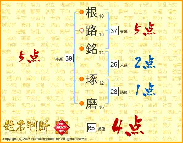 根(10画)路(13画)銘(14画) 琢(12画)磨(16画)