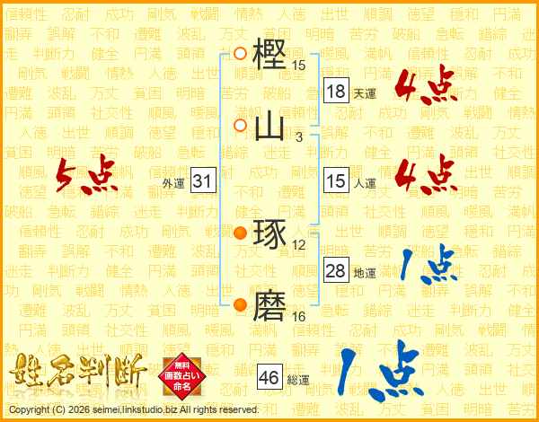 樫(15画)山(3画) 琢(12画)磨(16画)