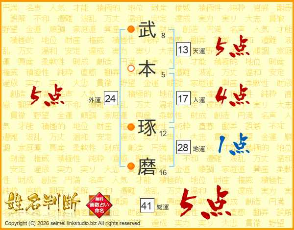 あなたの人生を表す1番重要な運勢です。生涯を通じて影響する総合運となり、主に50歳以降の晩年期に影響を及ぼします。苗字と名前の合計画数。