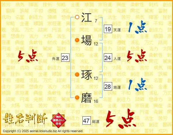 生活面を象徴する運勢です。外部から受ける影響力を表し、結婚運、家庭運や職場、環境への順応性を表します。総運から人運を引いた画数。姓や名が1文字の場合を除く。