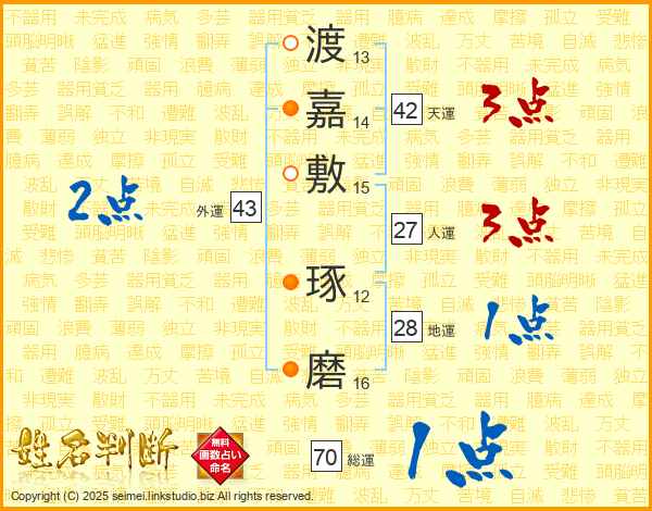 渡(13画)嘉(14画)敷(15画) 琢(12画)磨(16画)