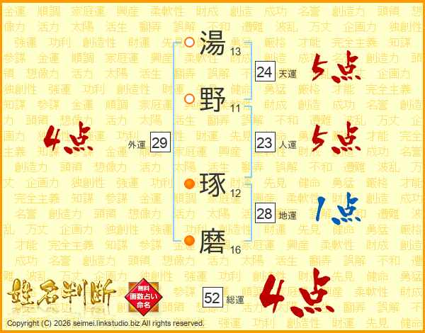 湯(13画)野(11画) 琢(12画)磨(16画)