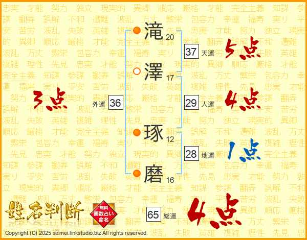 滝(20画)澤(17画) 琢(12画)磨(16画)