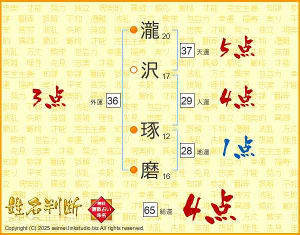 瀧沢琢磨さんの総運は65画の4点!