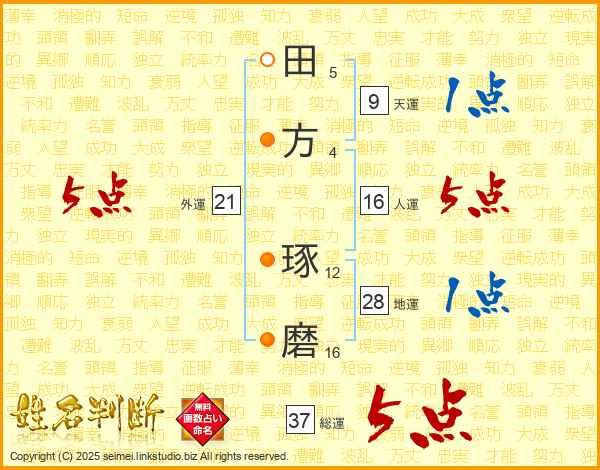 生活面を象徴する運勢です。外部から受ける影響力を表し、結婚運、家庭運や職場、環境への順応性を表します。総運から人運を引いた画数。姓や名が1文字の場合を除く。