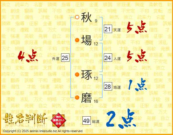 秋(9画)場(12画) 琢(12画)磨(16画)