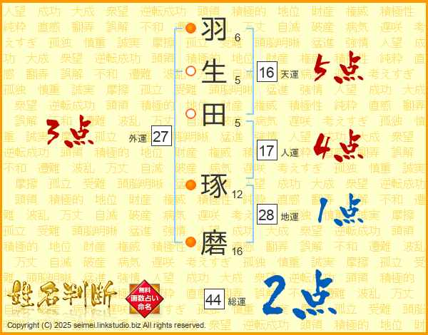 羽(6画)生(5画)田(5画) 琢(12画)磨(16画)