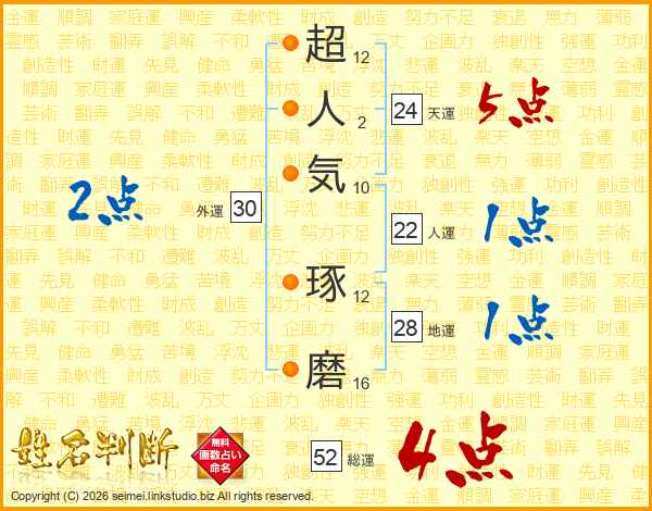 超(12画)人(2画)気(10画) 琢(12画)磨(16画)