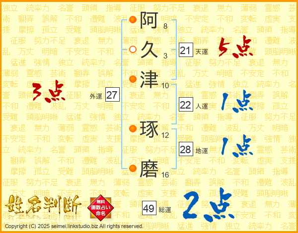 阿(8画)久(3画)津(10画) 琢(12画)磨(16画)