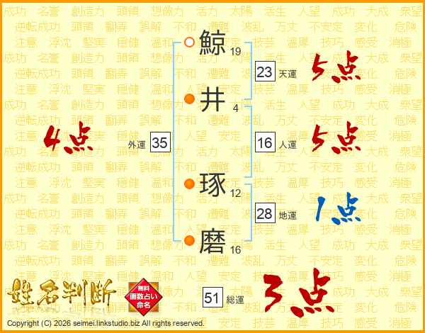 鯨(19画)井(4画) 琢(12画)磨(16画)