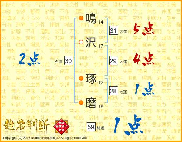 鳴沢琢磨さんの総運は59画の1点!
