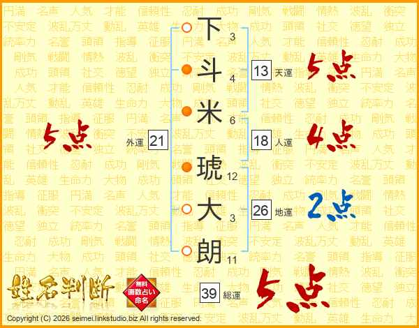 あなたの人生を表す1番重要な運勢です。生涯を通じて影響する総合運となり、主に50歳以降の晩年期に影響を及ぼします。苗字と名前の合計画数。