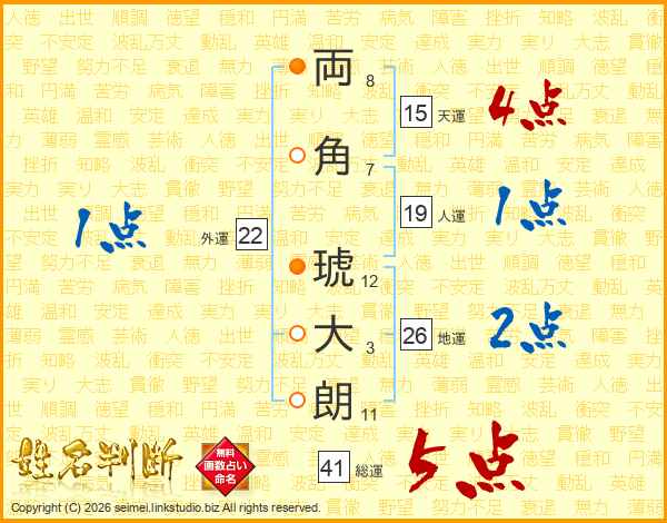 両(8画)角(7画) 琥(12画)大(3画)朗(11画)