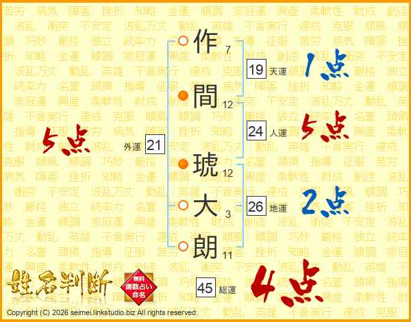作間琥大朗さんの地運は26画の2点!