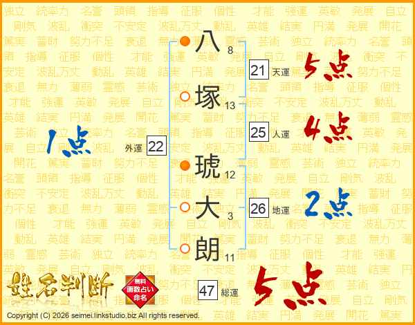 八塚琥大朗さんの地運は26画の2点!