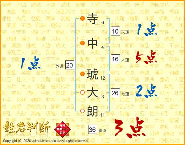 寺(6画)中(4画) 琥(12画)大(3画)朗(11画)