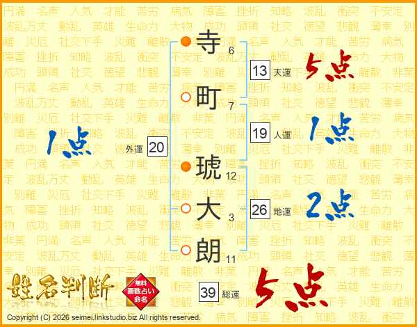 寺(6画)町(7画) 琥(12画)大(3画)朗(11画)