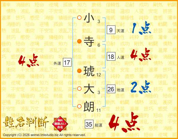 小(3画)寺(6画) 琥(12画)大(3画)朗(11画)