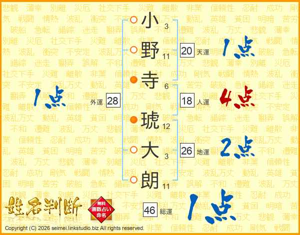小(3画)野(11画)寺(6画) 琥(12画)大(3画)朗(11画)