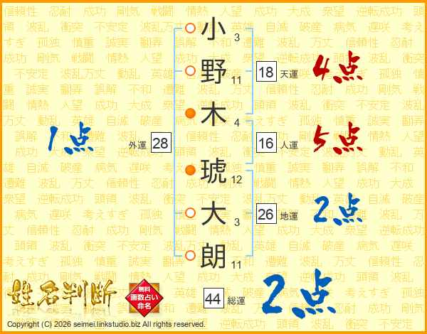 小(3画)野(11画)木(4画) 琥(12画)大(3画)朗(11画)