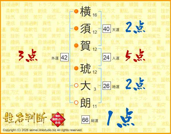 横(16画)須(12画)賀(12画) 琥(12画)大(3画)朗(11画)