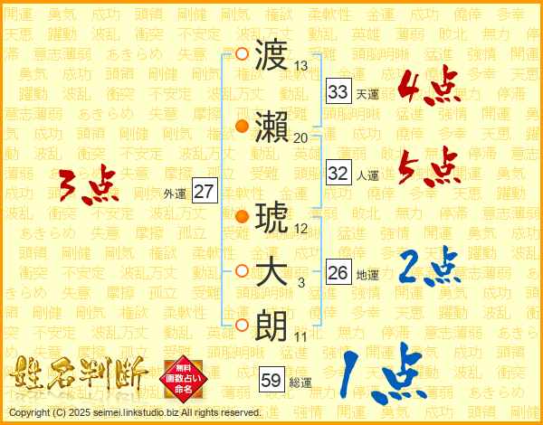 渡(13画)瀨(20画) 琥(12画)大(3画)朗(11画)