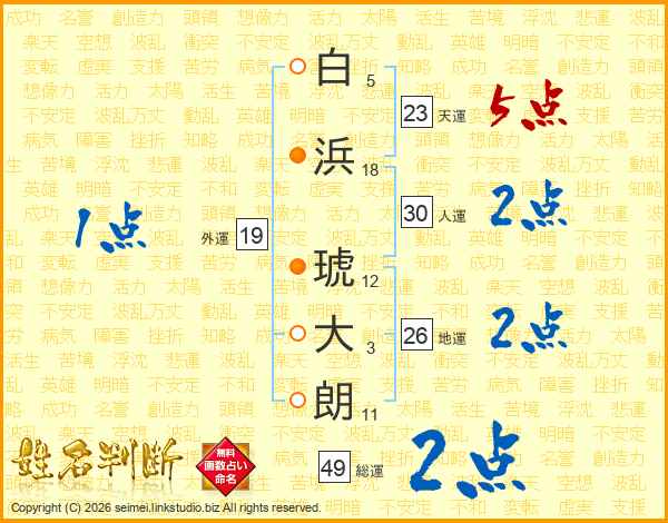 白(5画)浜(18画) 琥(12画)大(3画)朗(11画)