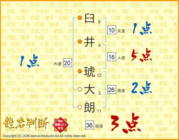 臼(6画)井(4画) 琥(12画)大(3画)朗(11画)
