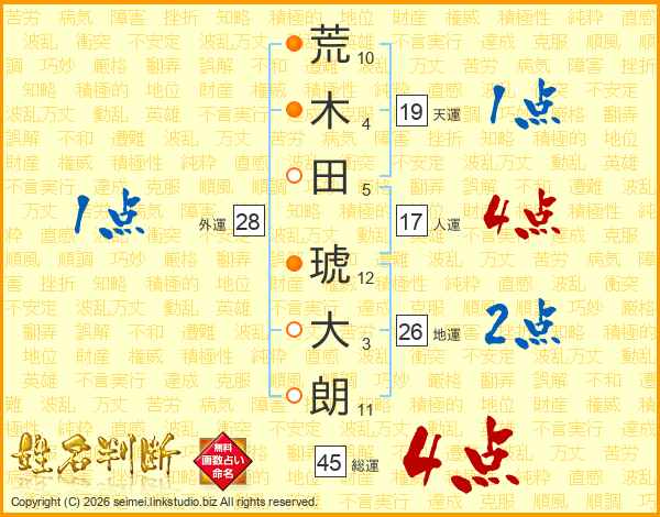 荒(10画)木(4画)田(5画) 琥(12画)大(3画)朗(11画)
