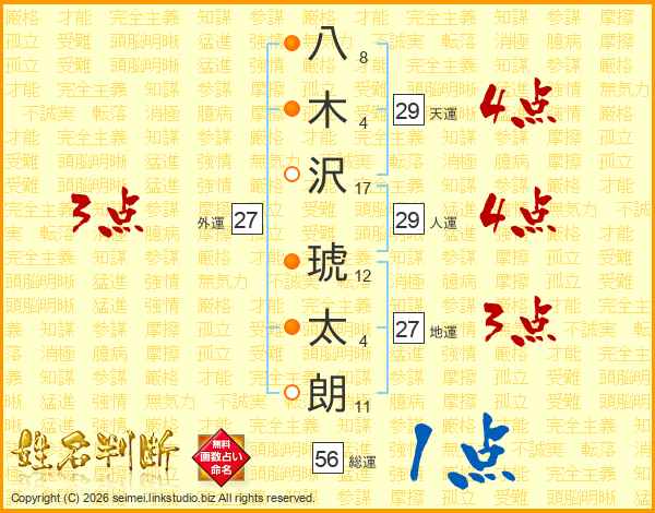 八木沢琥太朗さんの天運は29画の4点!