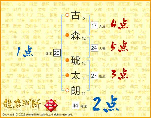 古(5画)森(12画) 琥(12画)太(4画)朗(11画)