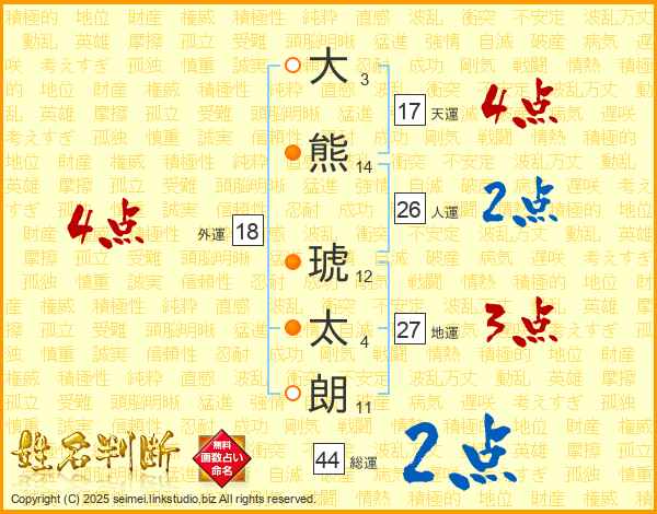 大(3画)熊(14画) 琥(12画)太(4画)朗(11画)
