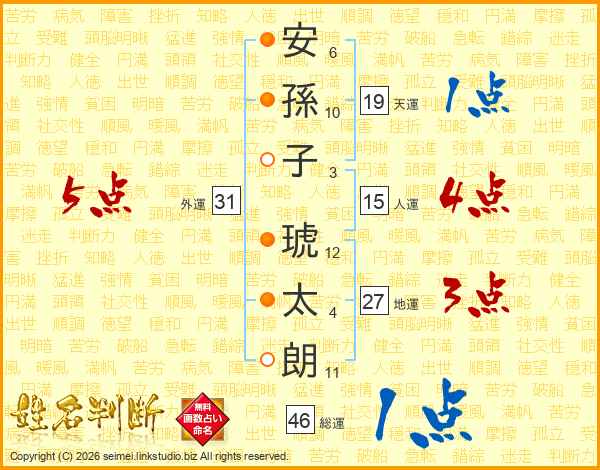 安(6画)孫(10画)子(3画) 琥(12画)太(4画)朗(11画)