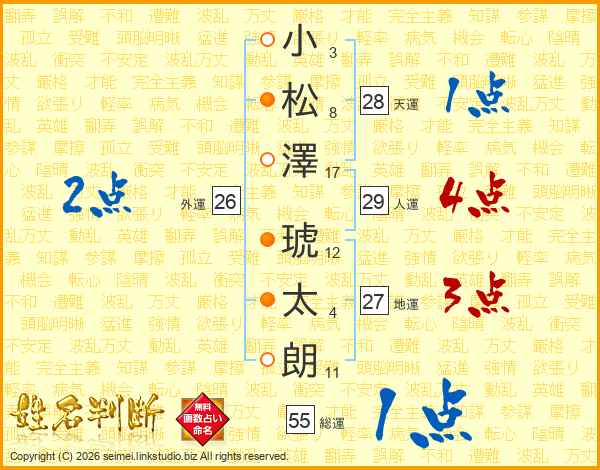 小(3画)松(8画)澤(17画) 琥(12画)太(4画)朗(11画)
