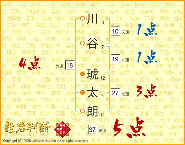 川(3画)谷(7画) 琥(12画)太(4画)朗(11画)