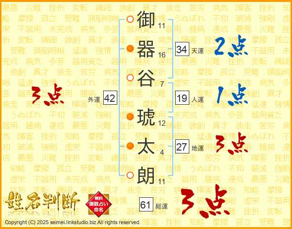 御(11画)器(16画)谷(7画) 琥(12画)太(4画)朗(11画)