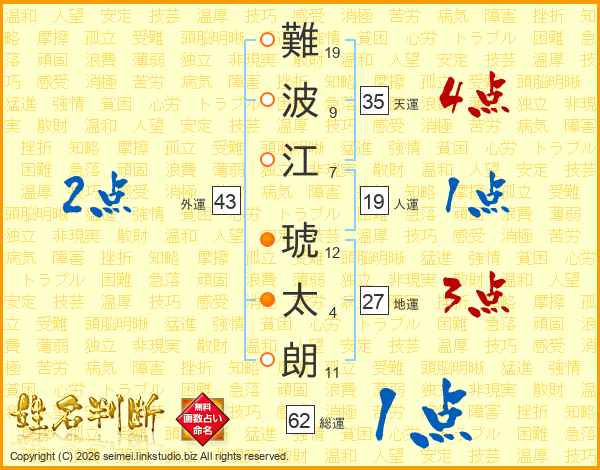 難(19画)波(9画)江(7画) 琥(12画)太(4画)朗(11画)