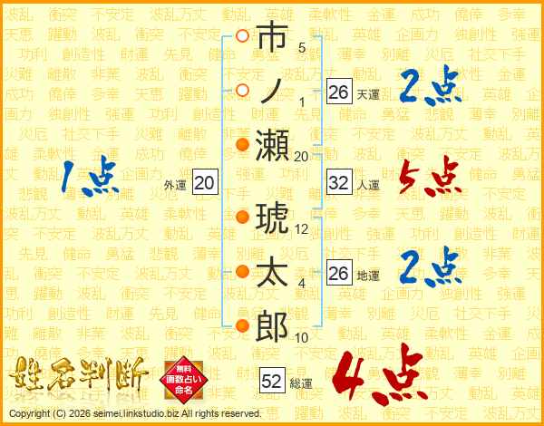 市ノ瀬琥太郎さんの総運は52画の4点!