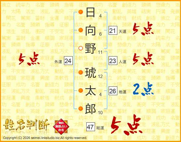 日向野琥太郎さんの総運は47画の5点!