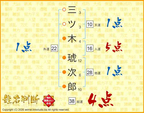 三(3画)ツ(3画)木(4画) 琥(12画)次(6画)郎(10画)