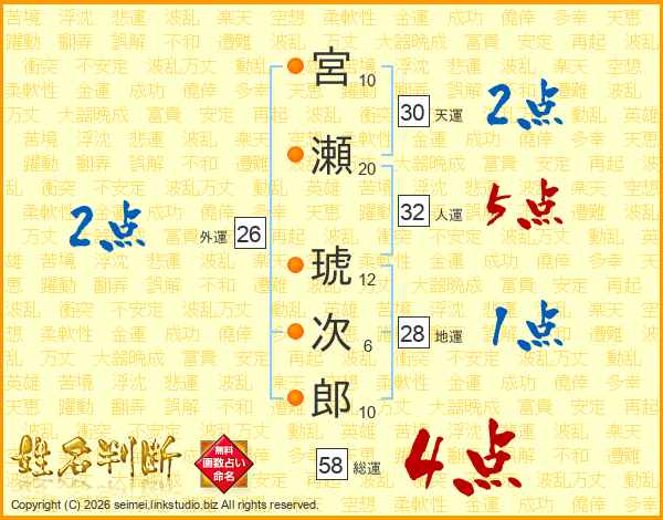 宮(10画)瀬(20画) 琥(12画)次(6画)郎(10画)