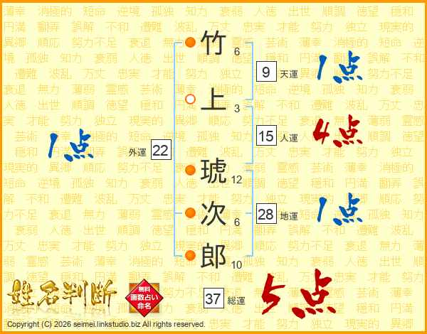 竹上琥次郎さんの総運は37画の5点!