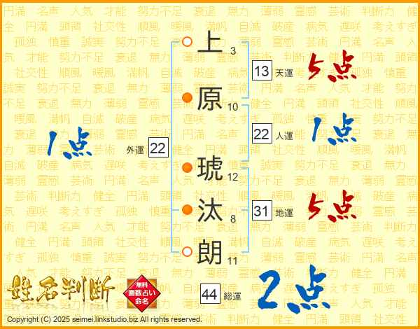 上原琥汰朗さんの総運は44画の2点!