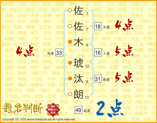 佐佐木琥汰朗さんの総運は49画の2点!