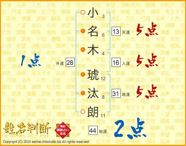 小(3画)名(6画)木(4画) 琥(12画)汰(8画)朗(11画)